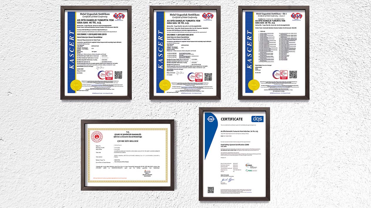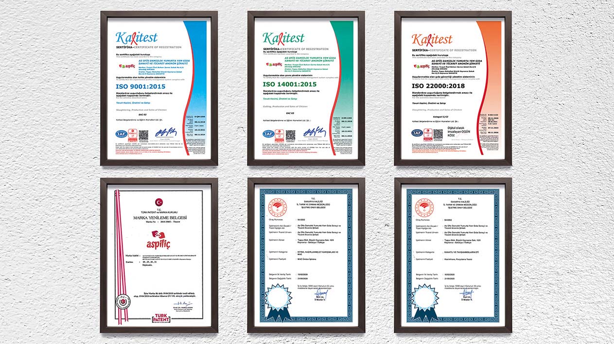 Bu doğrultuda, tüm süreçlerdeki kritik noktalar kontrol altında tutulur ve sürekli izlenir. Üretim ve diğer tüm süreçlerimiz, dünya çapında güvenli gıda tedarik edilmesini sağlama amacıyla ve HACCP sistemini de kapsayan ISO 22000 Gıda Güvenliği Yönetim Sistemi, FSSC 22000 Gıda Güvenliği Sistemi koşullarına göre yürütmektedir. Bununla beraber Helal Sertifikasyonuna sahip olan Aspiliç tesisleri, tüm girdilerin takibinden, taşıma ve depolama prosedürleri dahil edilerek, dağıtım zinciri ve perakendecilere kadar ortak gıda güvenliği gerekliliklerini sağlayan bir yönetim sistemine sahiptir. Aspiliç, ISO 9001 Toplam Kalite Yönetimi prensibini tüm işletmelerinde uygularken ISO 14001 Çevre Yönetim Sistemi gerekliliklerini de sağlamaktadır.